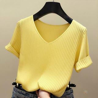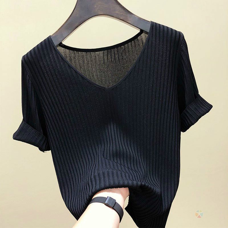 2021春夏季新款韩版冰丝针织上衣修身V领打底衫短袖t恤女装短袖潮